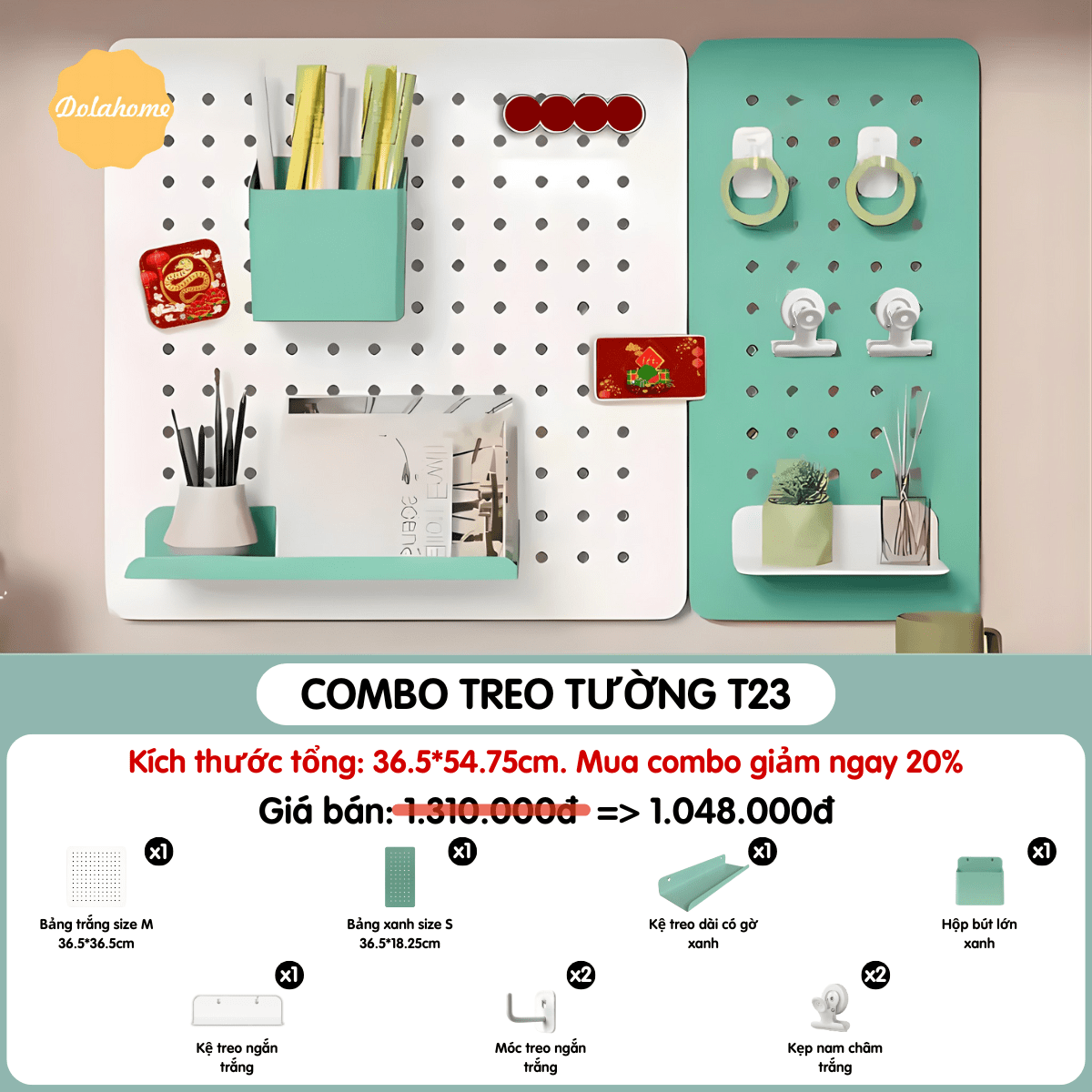 | Thương hiệu: DOLA HOME | Loại sản phẩm: Combo bảng treo tường đi kèm phụ kiện Pegboard | SKU: T23 |