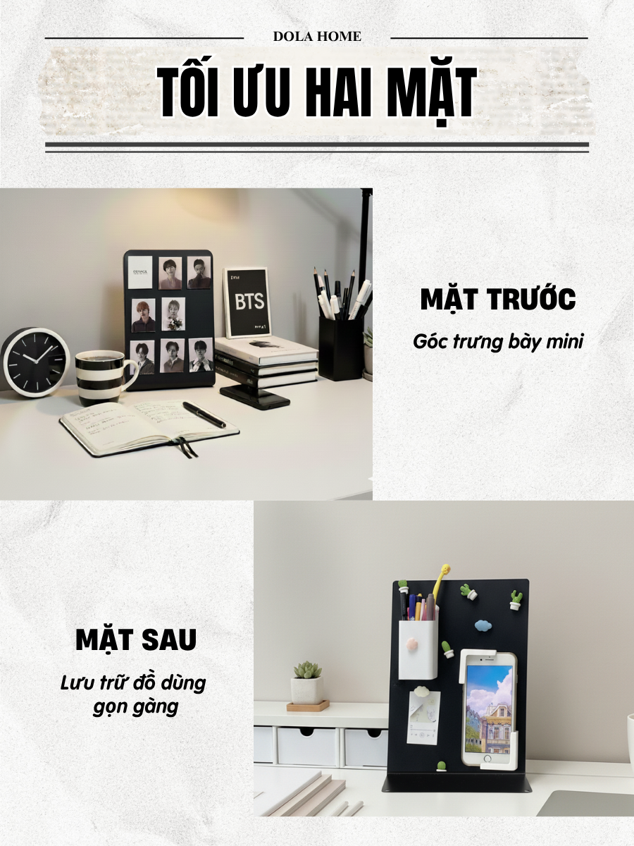 Mặt trước: trưng bày mini – gắn ảnh, quote, ghi chú