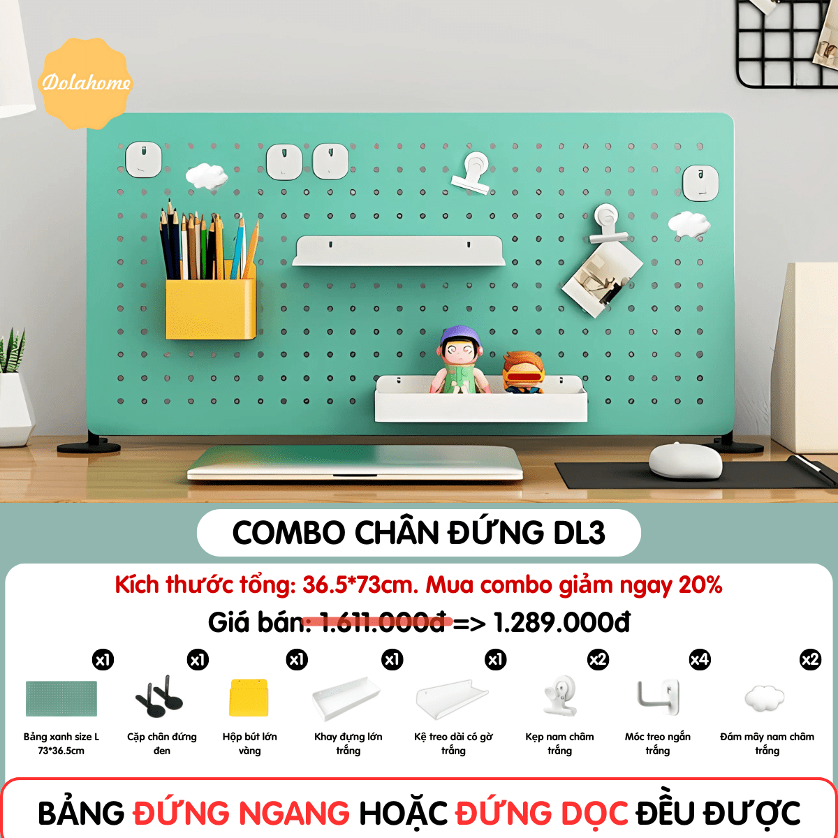 | Thương hiệu: DOLA HOME | Loại sản phẩm: Combo bảng chân đứng đi kèm phụ kiện Pegboard | SKU: DL3 |